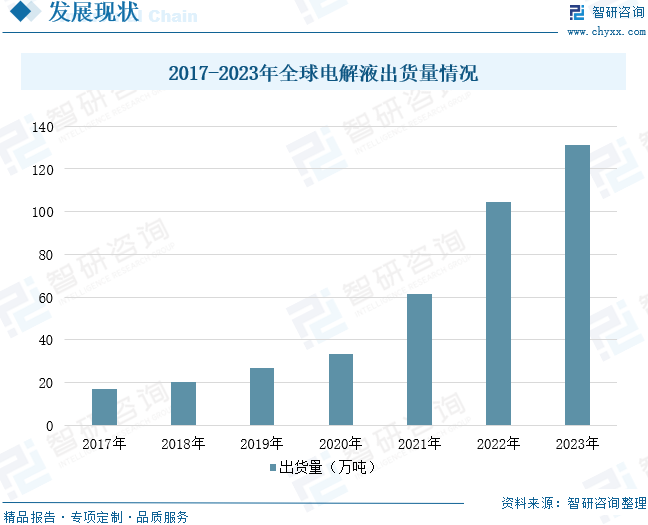 通常電解液占電池重量和體積的比重分別為15%、32%,其對純度及雜質的含量要求非常高,生產過程中需要高純的原料以及必要的提純工藝。2017年至2022年全球電解液出貨量由16.7萬噸增長至104.3萬噸,2023年全球電解液出貨量約為131.26萬噸。
