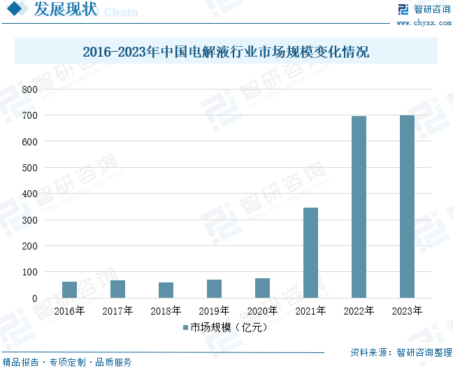 近年來,隨著全球及國內新能源汽車和鋰電池行業快速發展,國內在電解液材料方面已具備一定的產能和技術優勢,也使得我國電解液市場規模不斷增長;尤其是2021年得到迅速發展。數據顯示,2021年,我國電解液市場規模迅速增長,約為346.53億元,同比上升355%。2023年我國電解液市場規模約為700億元。