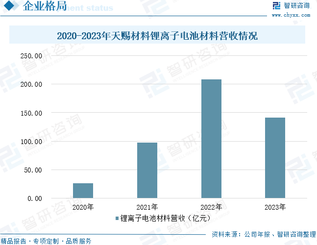 廣州天賜高新材料股份有限公司主營業務為精細化工新材料的研發、生產和銷售,屬于精細化工行業,主要產品為鋰離子電池材料、日化材料及特種化學品。公司生產的鋰離子電池材料主要為鋰離子電池電解液和正極材料磷酸鐵鋰,均為鋰離子電池關鍵原材料。同時,圍繞主要產品,公司還配套布局電解液和磷酸鐵鋰關鍵原料的生產能力,包括六氟磷酸鋰、新型電解質、添加劑、磷酸鐵、碳酸鋰加工以及鋰輝石精礦等。電解液和正極材料磷酸鐵鋰用于生產鋰離子電池,鋰離子電池在新能源汽車、消費電子產品和儲能領域均有廣泛應用。數據顯示,2023年天賜材料鋰離子電池材料營收為141.04億元。