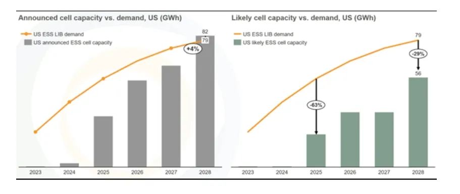 對于美國儲能行業(yè)而言,其可能被認(rèn)為依賴于廉價進(jìn)口的磷酸鐵鋰(LFP)電池。然而,首個針對電池儲能產(chǎn)品的關(guān)稅是拜登政府于2024年5月宣布的,即從2026年開始對中國制造的電池征收25%關(guān)稅。此舉與先進(jìn)的制造業(yè)稅收抵免以及對美國國內(nèi)制造產(chǎn)品投資的稅收抵免措施相結(jié)合,旨在加速美國電池制造業(yè)發(fā)展。這一舉措已經(jīng)初見成效,據(jù)清潔能源協(xié)會(CEA)統(tǒng)計(jì),目前美國宣布的用于儲能系統(tǒng)的電池產(chǎn)能已超過80GWh,預(yù)計(jì)將在2028年前實(shí)現(xiàn)這一目標(biāo)。