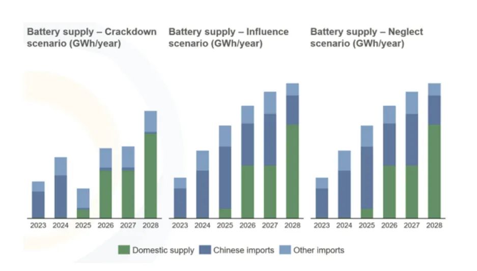 如何填補(bǔ)剩余的供應(yīng)缺口將取決于眾多難以預(yù)測的因素,特別是圍繞UFLPA法案對進(jìn)口電池的限制和承諾提高關(guān)稅。為此,清潔能源協(xié)會(CEA)為UFLPA戰(zhàn)略設(shè)定了三種可能的情景: