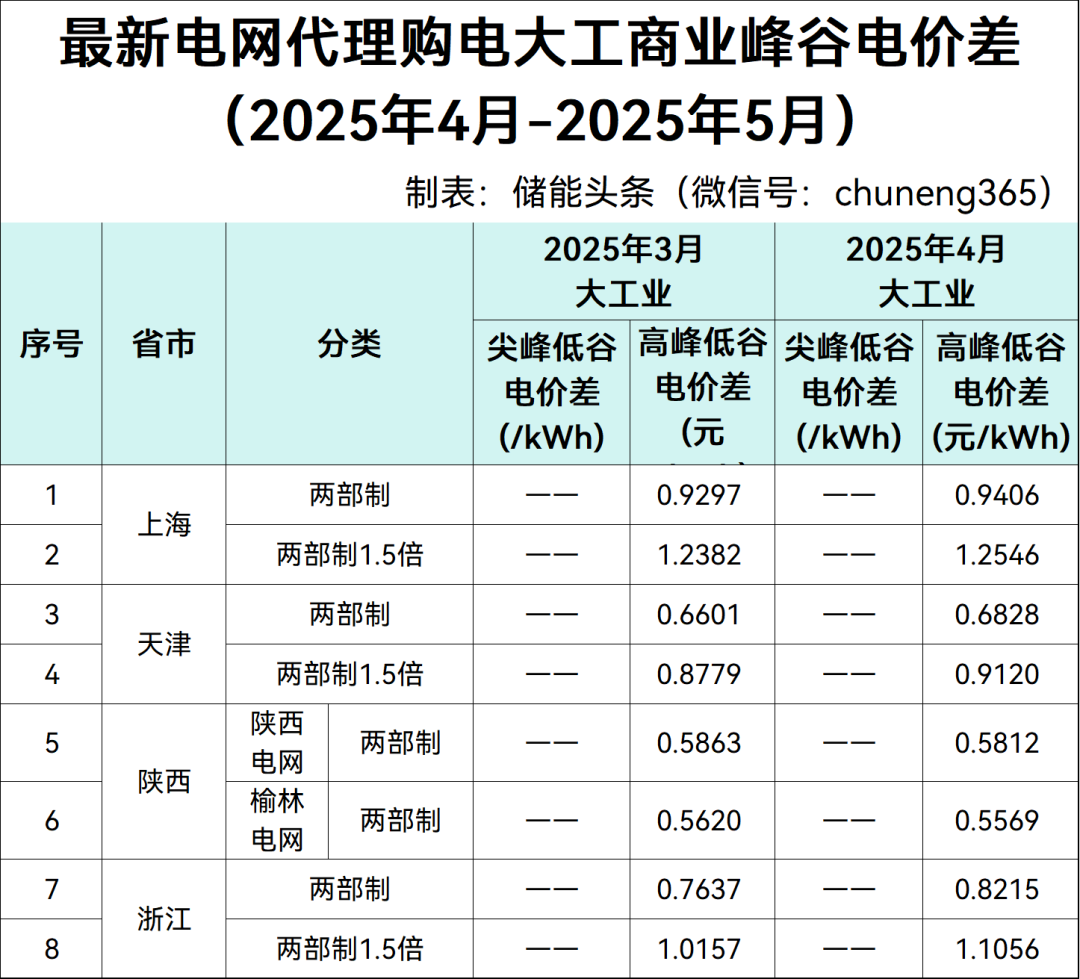 最新!2025年5月全國(guó)代理購(gòu)電價(jià)格!最大峰谷價(jià)差1.36元/kWh、15地超0.7元/kWh!