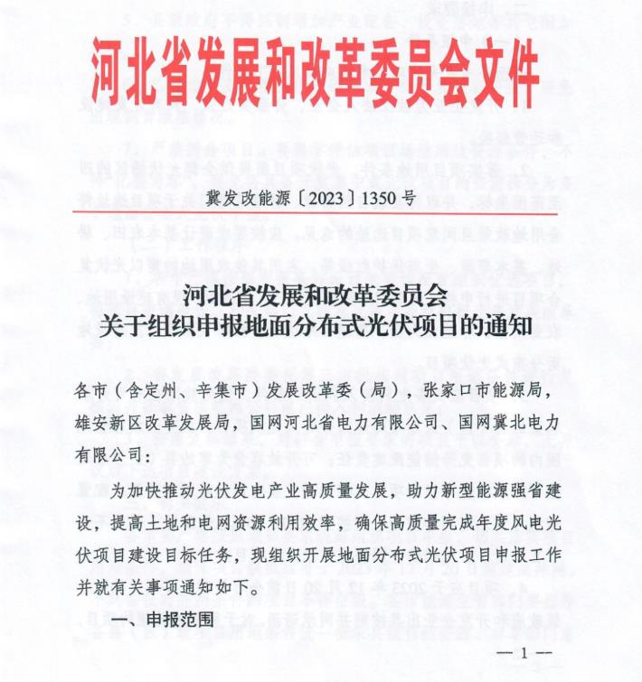 10月20日,河北省發展和改革委員會發布關于組織申報地面分布式光伏項目的通知,本次項目范圍為以10千伏及以下電壓等級接入電網,裝機規模6兆瓦及以下的地面分布式光伏發電項目。