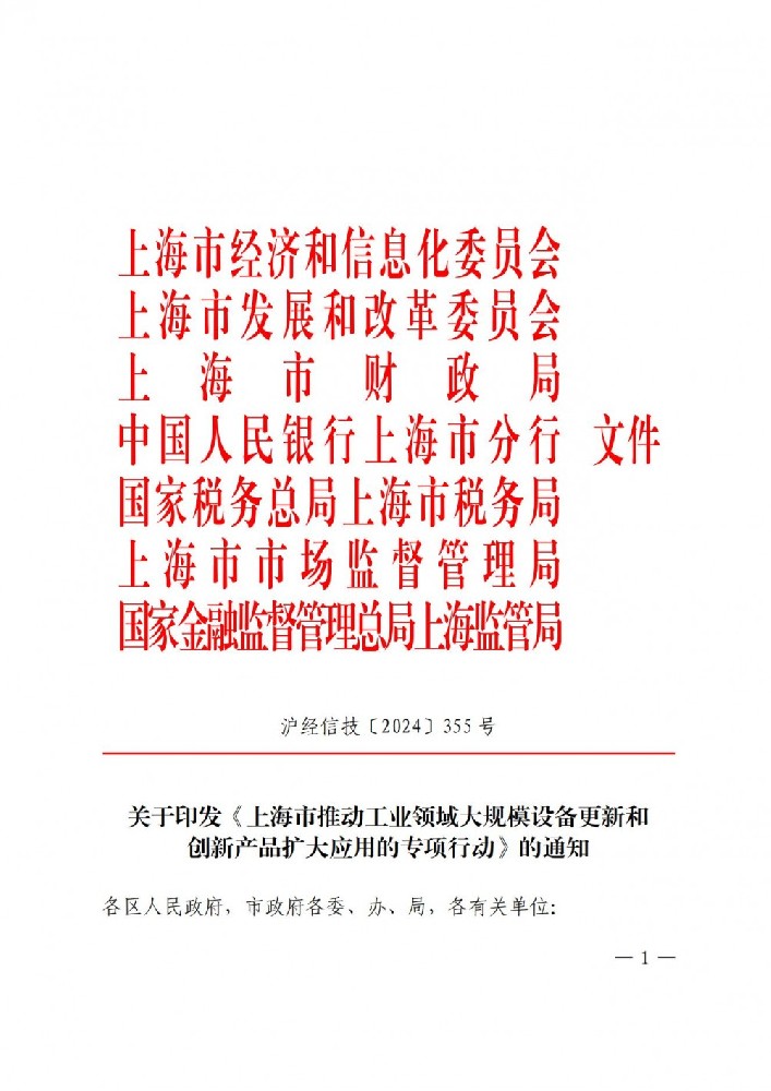 5月31日,上海市經濟和信息化委員會等七部門印發《上海市推動工業領域大規模設備更新和創新產品擴大應用的專項行動》。