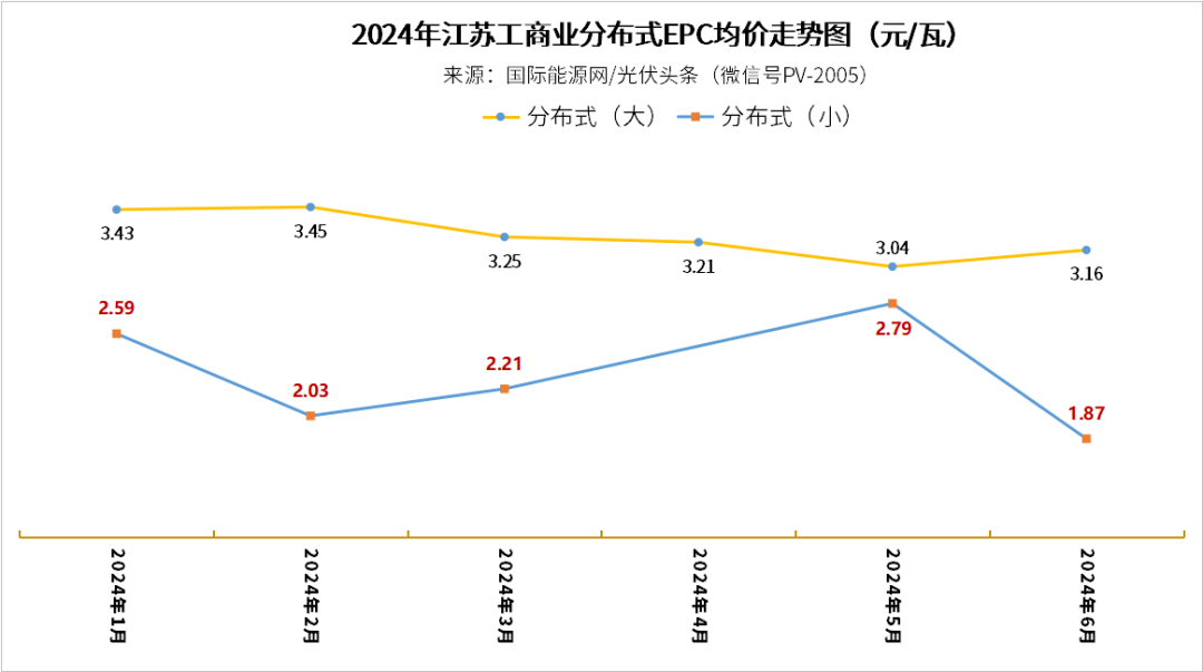 今年一季度,江蘇工商業新增裝機2.416GW,超越浙江成為工商業第一裝機大省。江蘇工商業分布式EPC價格具有指標性意義。從價格走勢來看,1月,工商業光伏大EPC均價3.43元/W,2月達到上半年最高點3.45元/W。5月下探至最低點,均價為3.04元/W。