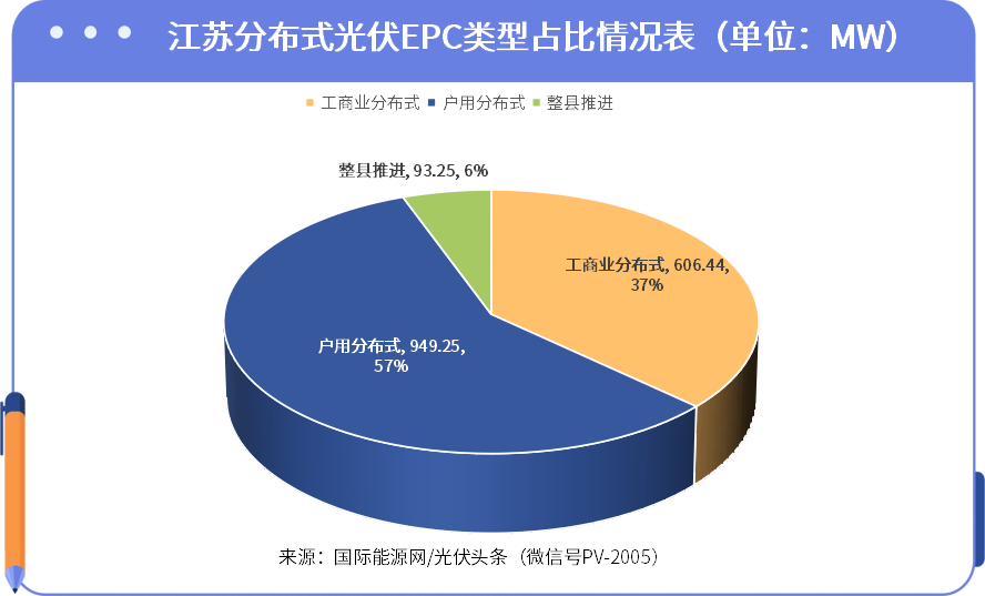 具體分布式EPC方面,工商業分布式合計容量606.44MW,占比達到37%;整縣推進集中開發項目合計容量93.25MW,占比6%;戶用分布式占比最高達57%。