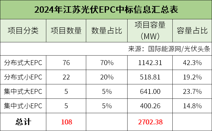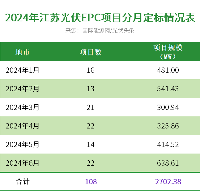 國際能源網/光伏頭條(PV-2005)統計,2024年上半年,江蘇有108個光伏EPC項目定標,合計容量2702.38MW。