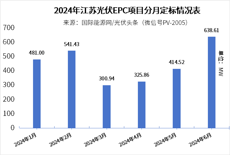國際能源網/光伏頭條(PV-2005)統計今年上半年108個項目之中,6月定標容量638.61MW,排名第一。2月定標容量541.43MW列次席,此外1月481MW排名第三。從時間分布來看,上半年江蘇EPC分月定標趨于平穩,從3月開始穩中有升。