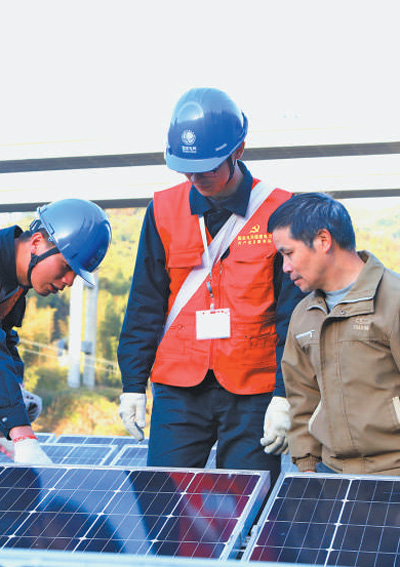 國網福建省電力公司員工幫助用戶檢查光伏發電板。