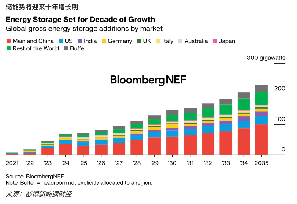 全球新增儲能裝機容量在2024年創下紀錄,隨后直至2035年將以17.0%的年復合增長率增長,2035年年新增裝機容量達227GW/955GWh 。相比之下,全球風電和光伏市場同期的年復合增長率分別為7.0%和7.5%。
