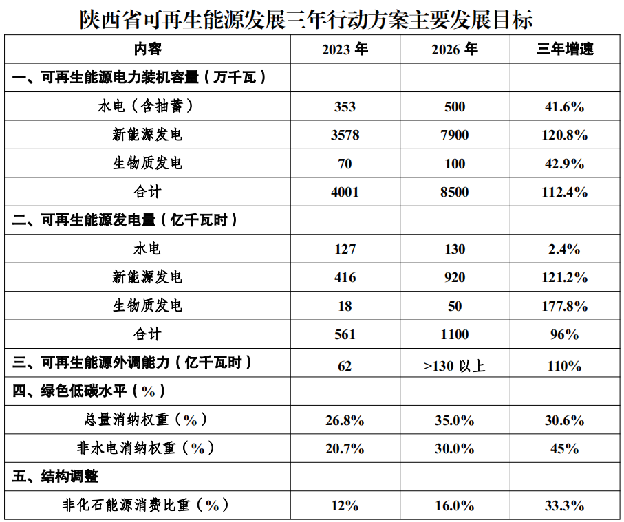 每年競爭10GW可再生能源建設規模,到2026年建成榆林20GW級;延安、渭南10GW級,全省20個GW級可再生能源發展示范縣。